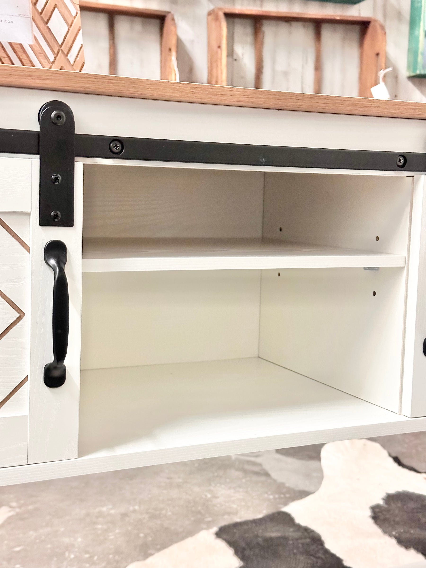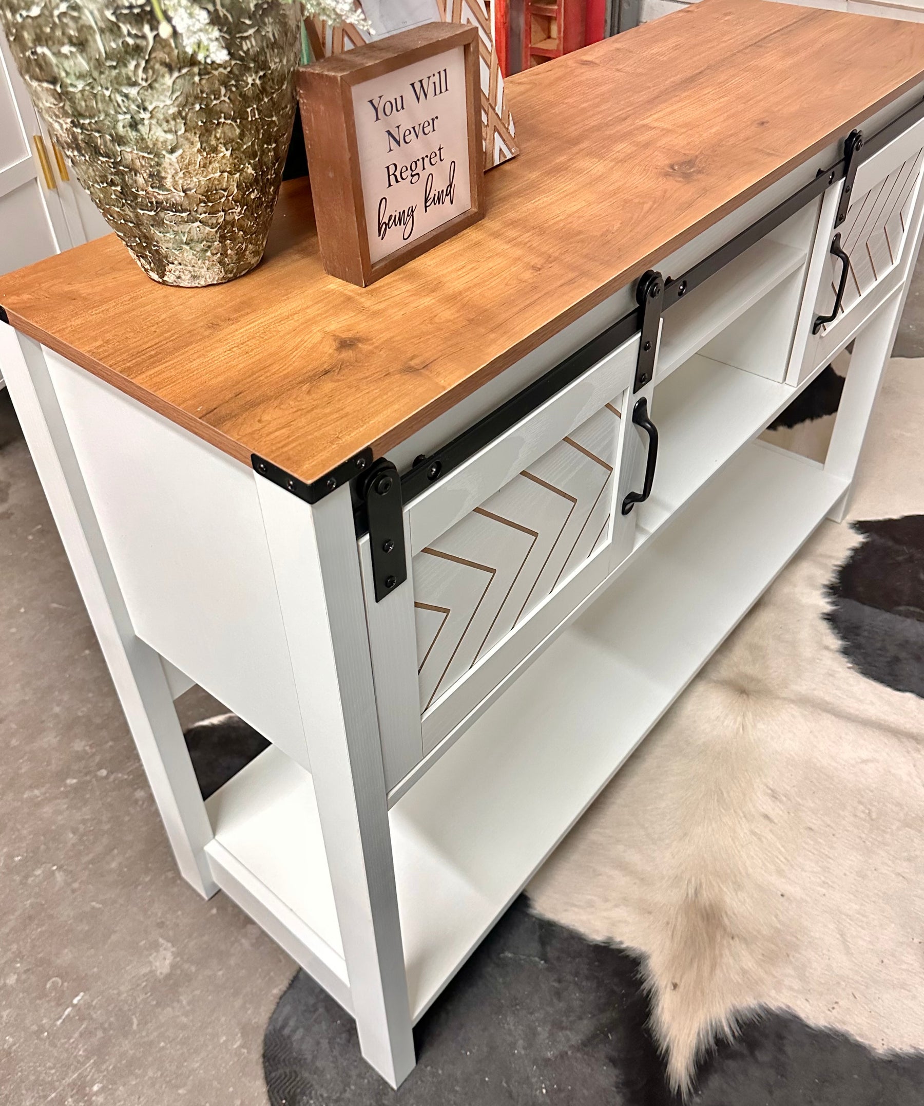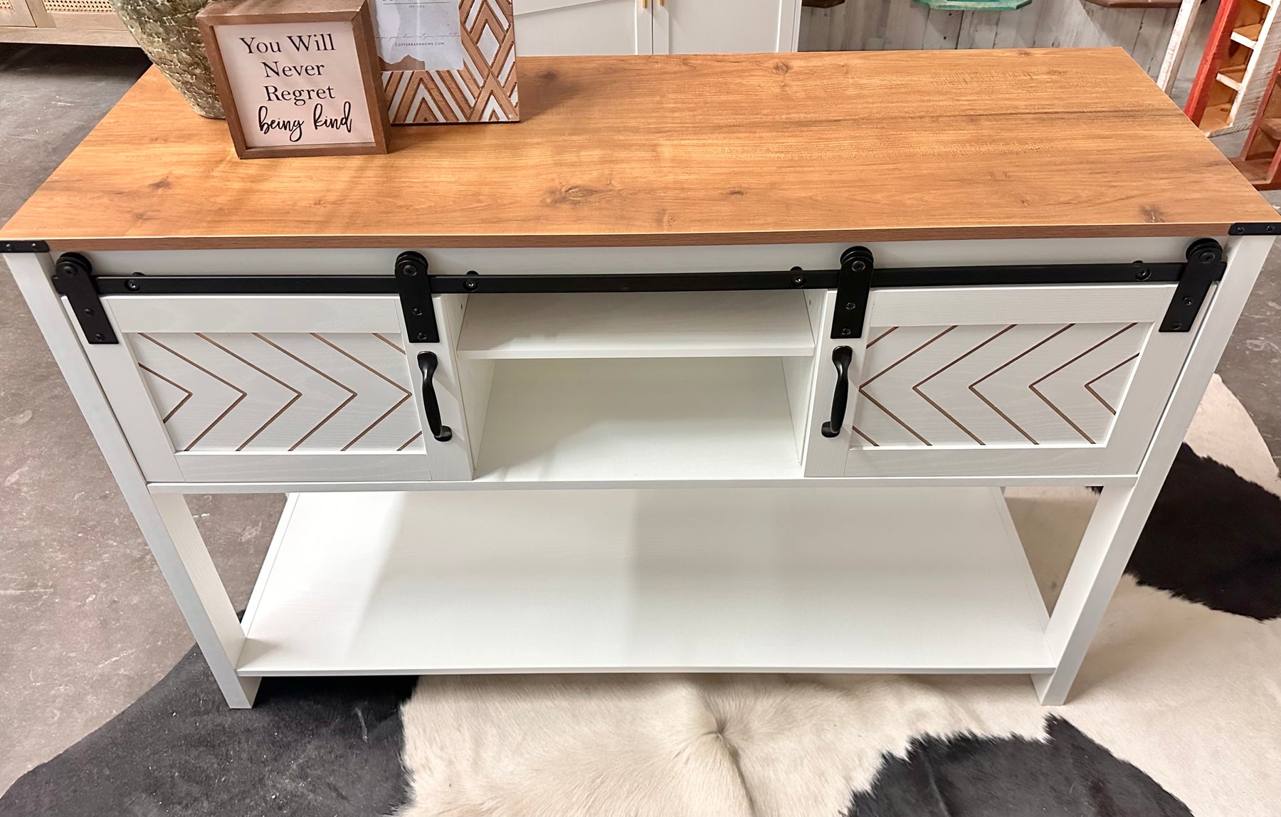 Bring warmth, character, and smart storage into your home with this beautifully designed farmhouse console table. Featuring a rich brown top, crisp white finish, and eye-catching sliding barn doors with black metal hardware, this piece instantly elevates any entryway, living room, or hallway.