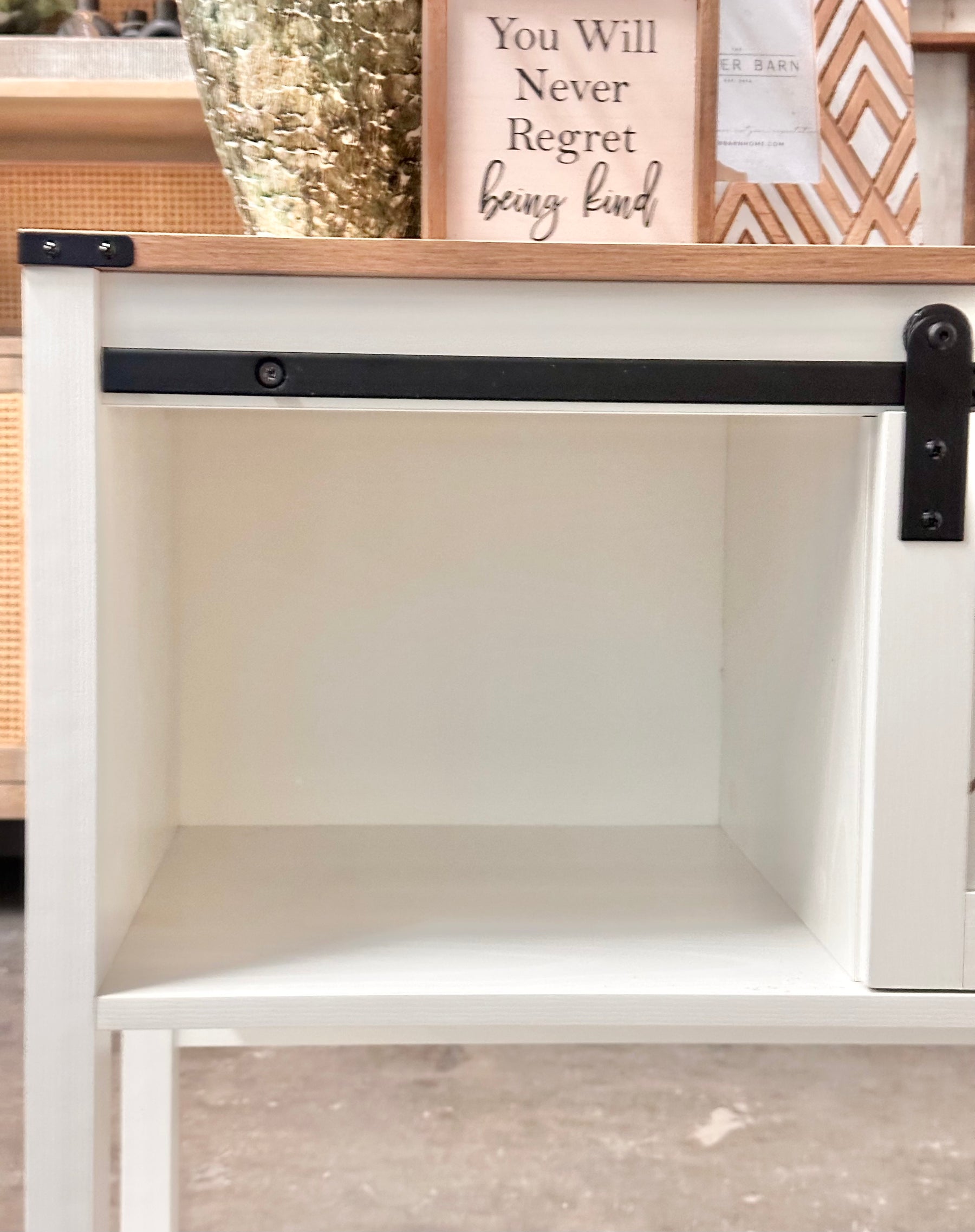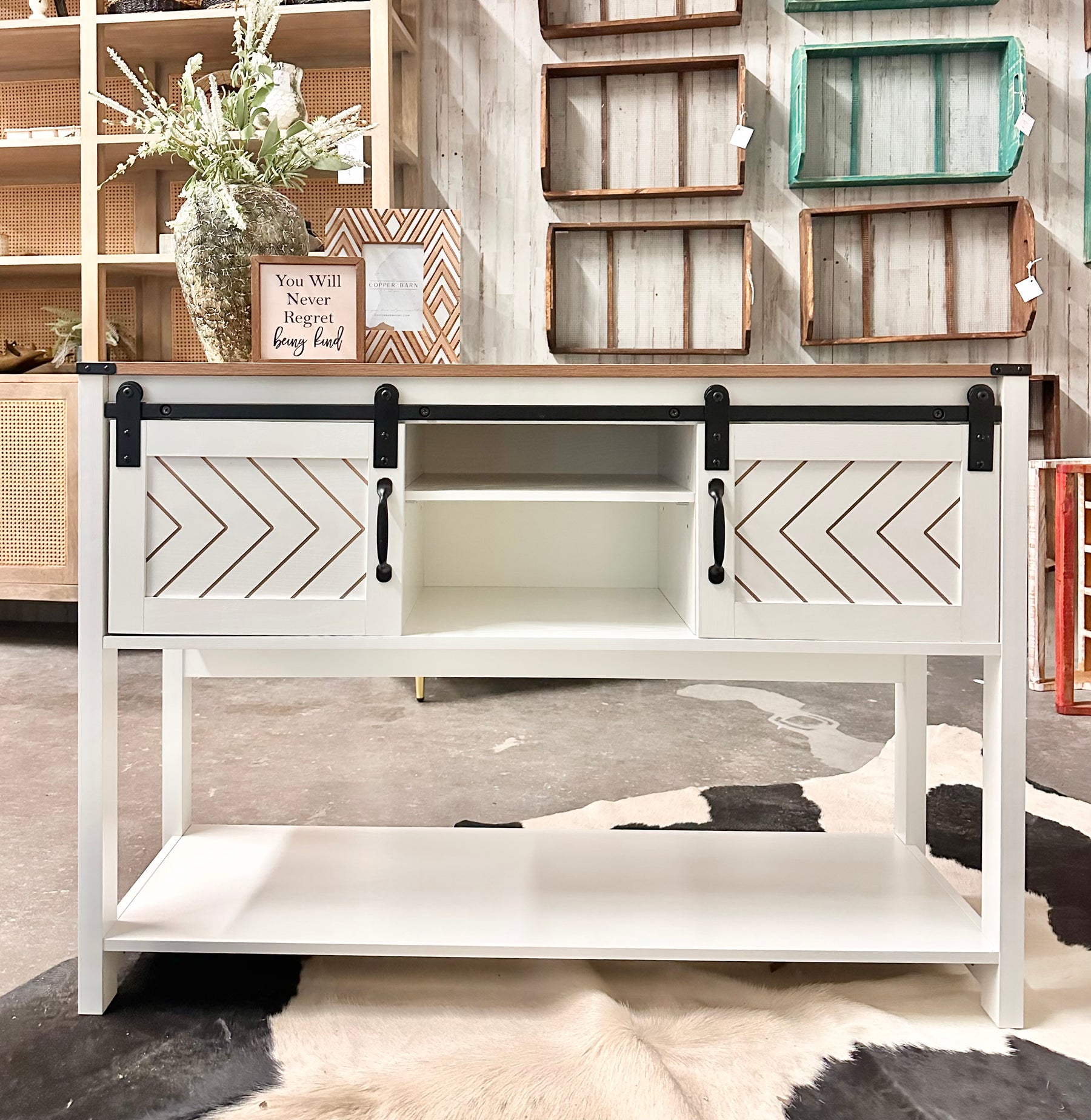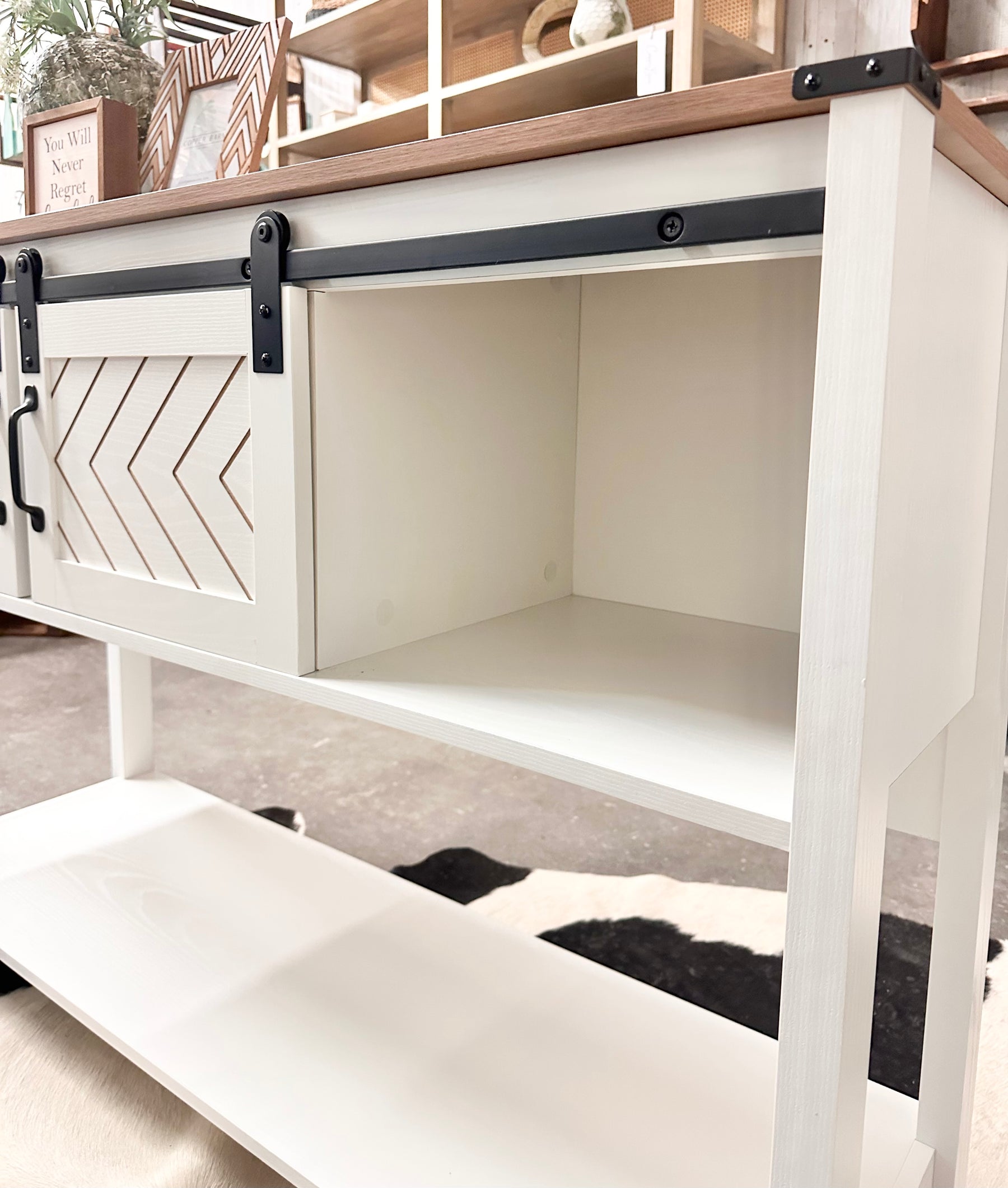 Bring warmth, character, and smart storage into your home with this beautifully designed farmhouse console table. Featuring a rich brown top, crisp white finish, and eye-catching sliding barn doors with black metal hardware, this piece instantly elevates any entryway, living room, or hallway.
