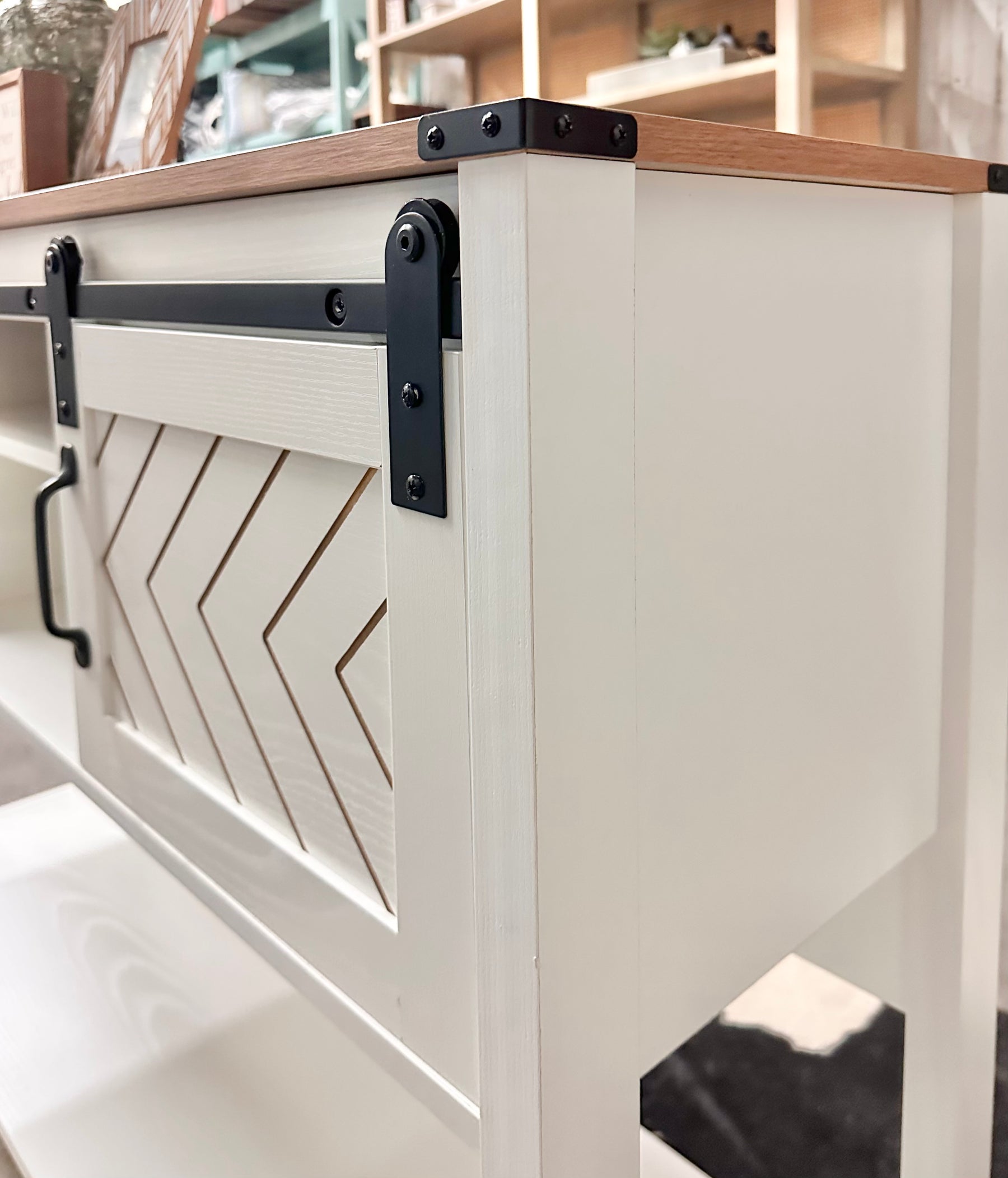 • Signature Barn Door Design: Chevron-pattern sliding doors add rustic charm while smoothly concealing clutter.