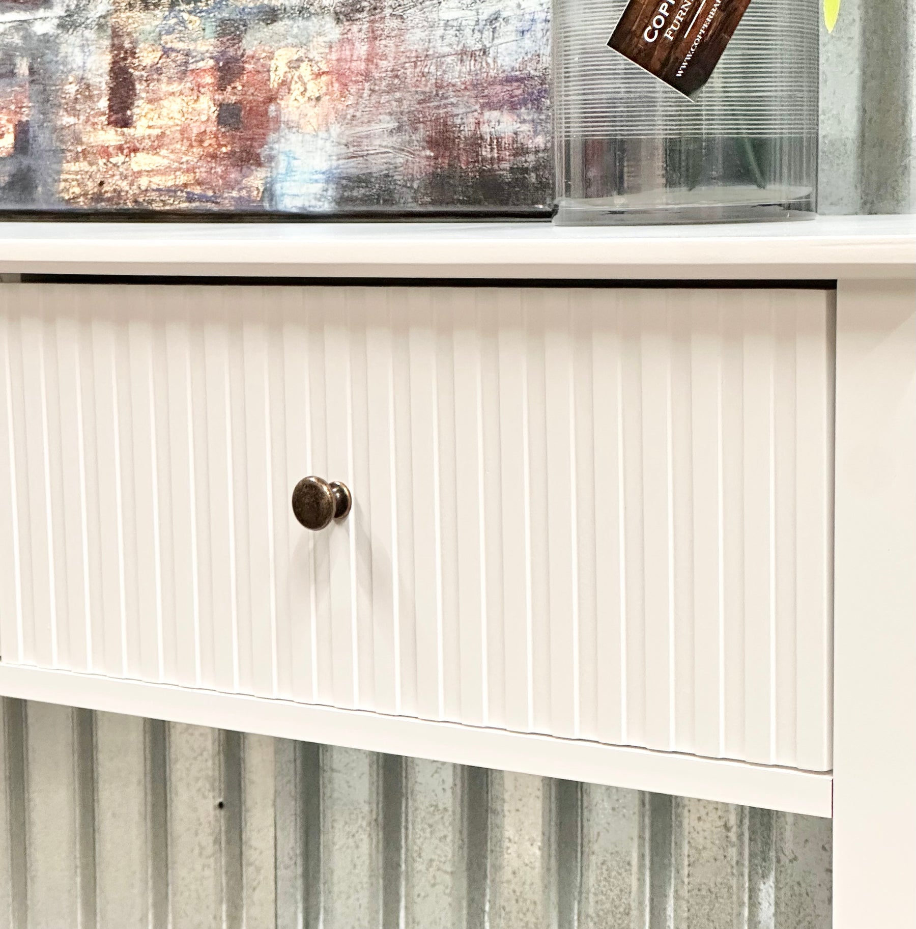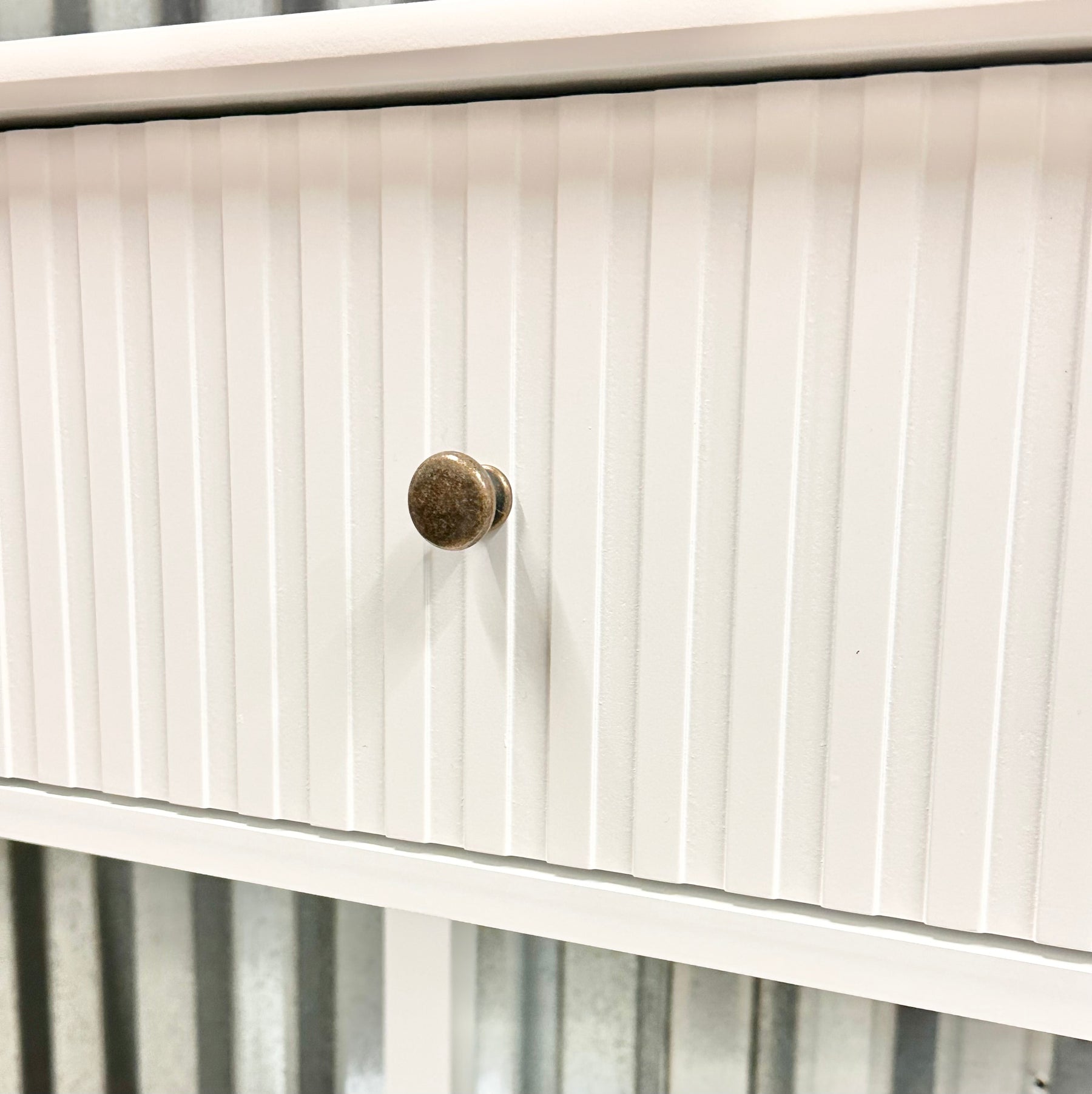 - Fluted drawer fronts with brass-tone knobs