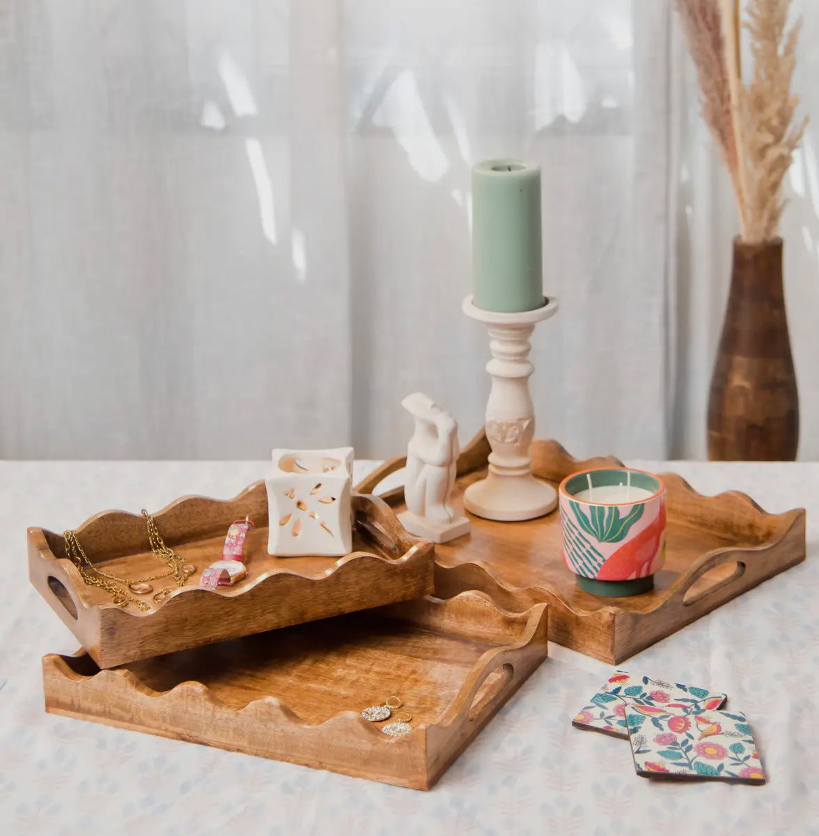 Add an artistic touch to your tablescape with the Scallop Tray. Featuring sculpted scalloped edge - perfect for serving or displaying food and treasures. It’s easy to grip handles ensure seamless hosting. Handcrafted with precision and finished with care, this tray blends beauty and functionality.