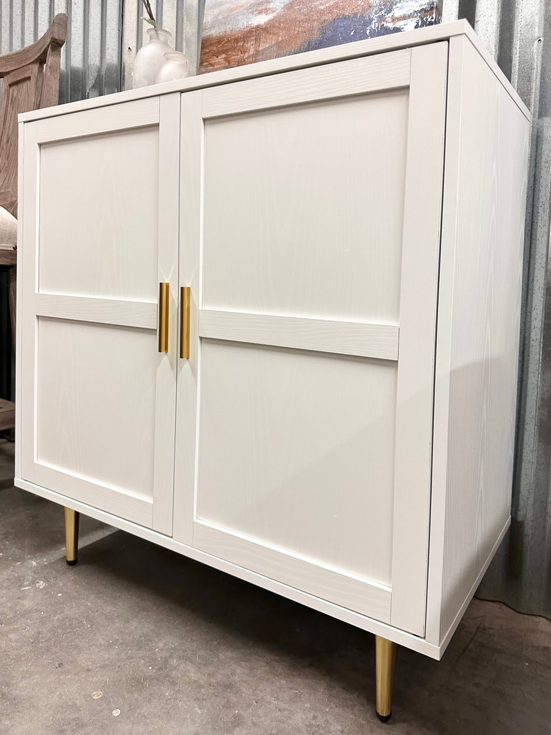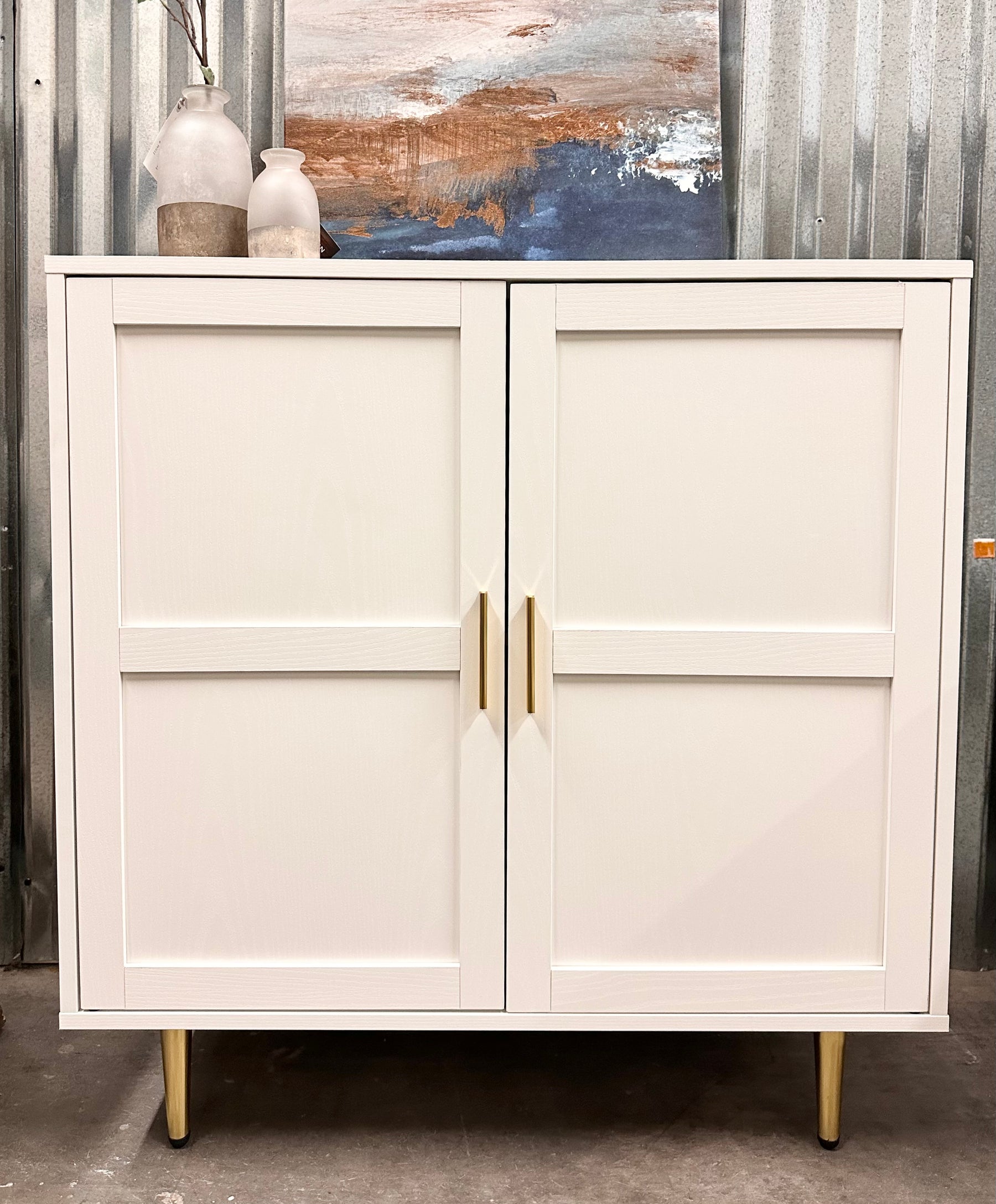 Refresh your space with this beautifully designed storage cabinet that blends modern simplicity with subtle luxury. Featuring a crisp white finish, sleek panel-front doors, and warm gold-tone hardware and legs, this piece delivers a polished, designer look while keeping clutter completely out of sight.