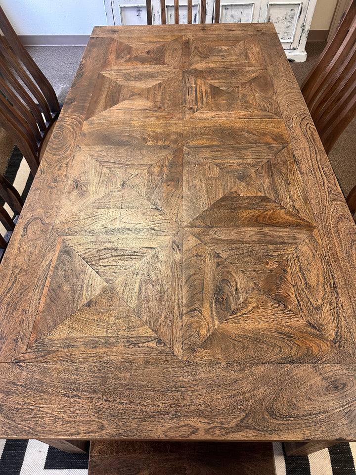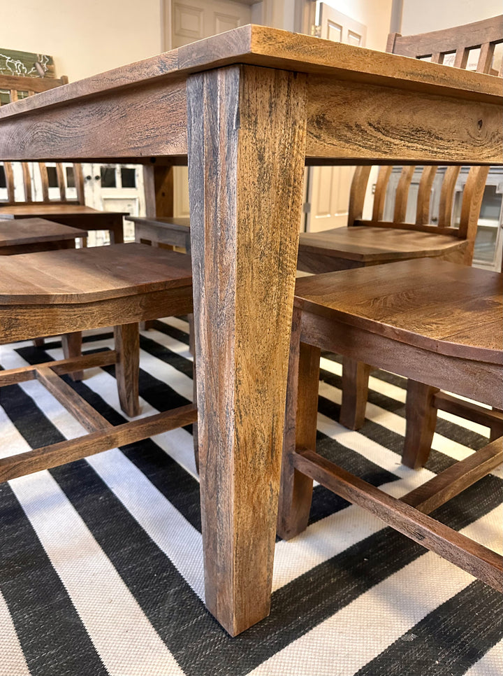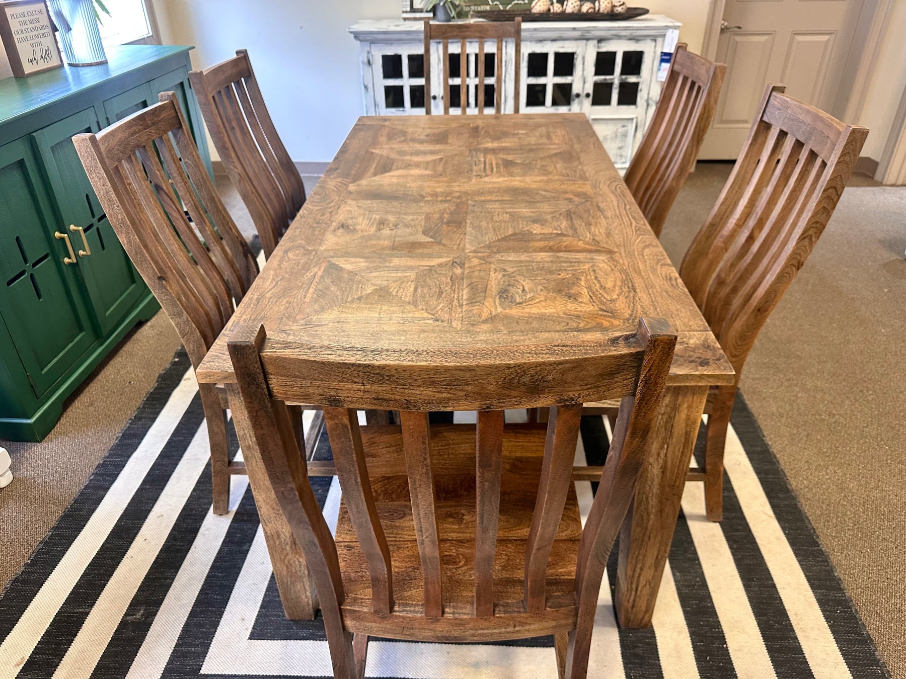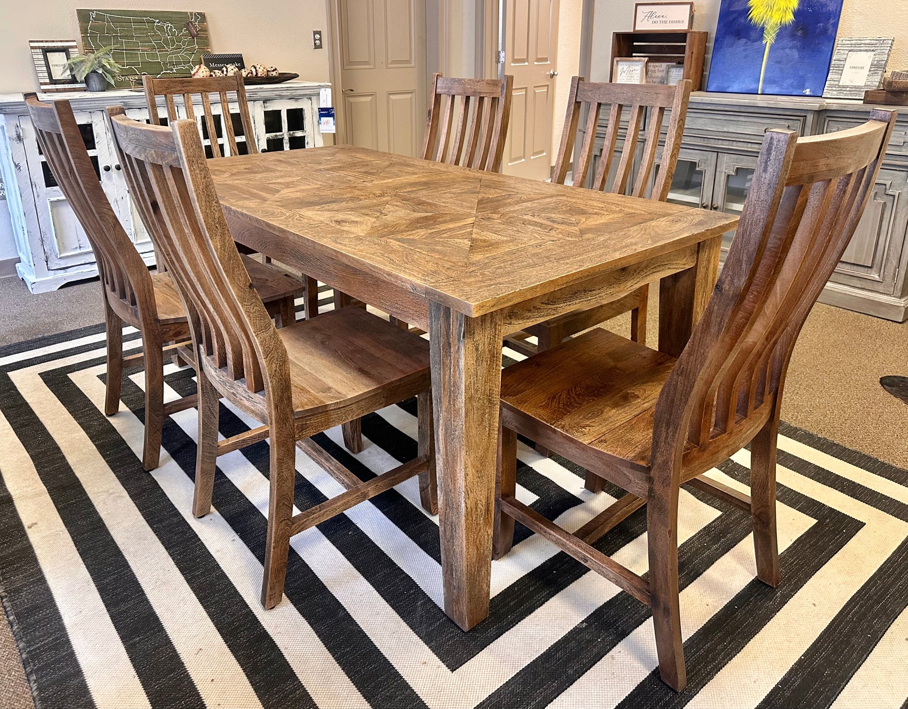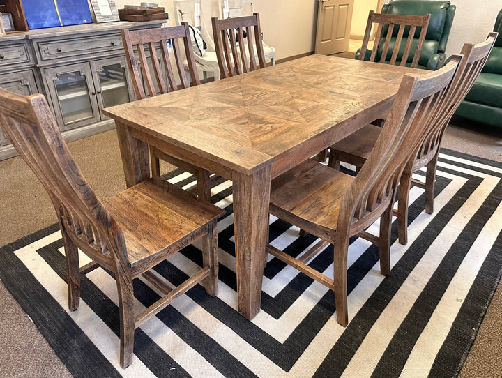 The parquet wood table top and shaker legs creates the classic dining collection for your family and friends to gather around.